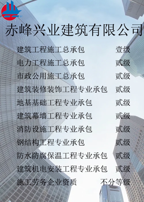 赤峰興業(yè)建筑有限公司簡介 赤峰興業(yè)建筑有限公司成立于1998年7月,位于內(nèi)蒙古赤峰市松山區(qū)?,F(xiàn)已發(fā)展成為擁有建筑工程施工總承包壹級(jí)、電力工程施工總承包貳級(jí)、市政公用工程施工總承包貳級(jí)、承裝、修、試四級(jí)、?建筑裝修裝飾工程專業(yè)承包貳級(jí)、建筑幕墻工程專業(yè)承包貳級(jí)、消防設(shè)施工程專業(yè)承包貳級(jí)、地基基礎(chǔ)工程專業(yè)承包貳級(jí)、鋼結(jié)構(gòu)工程專業(yè)承包貳級(jí)、建筑機(jī)電工程專業(yè)承包二級(jí)、防水防腐保溫工程專業(yè)承包貳級(jí)以及建筑施工勞務(wù)等資質(zhì)的綜合性建筑施工企...